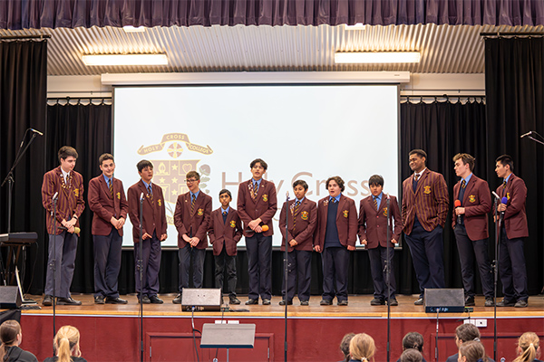 Holy Cross College is a school that sings! At every assembly and mass the whole student body raises the roof with their combined voices in a joyful demonstration of school spirit. Students who wish to develop singing skills further have the option of joining the college choir, a mixed year group ensemble which rehearses once a week to prepare songs to lead the college for liturgies as well as perform a wide range of repertoire for college assemblies, open day and the Sydney Catholic Schools Eisteddfod.